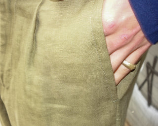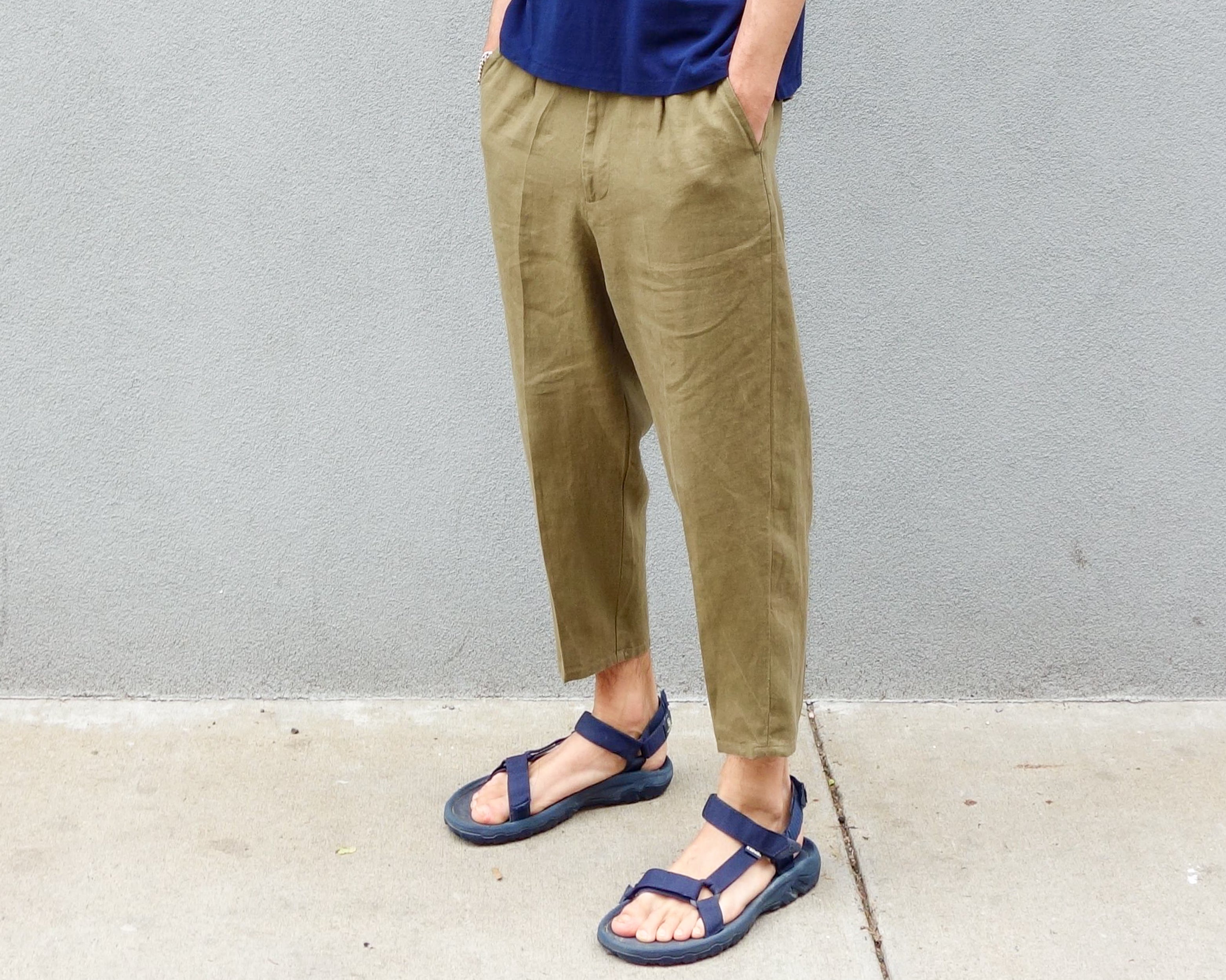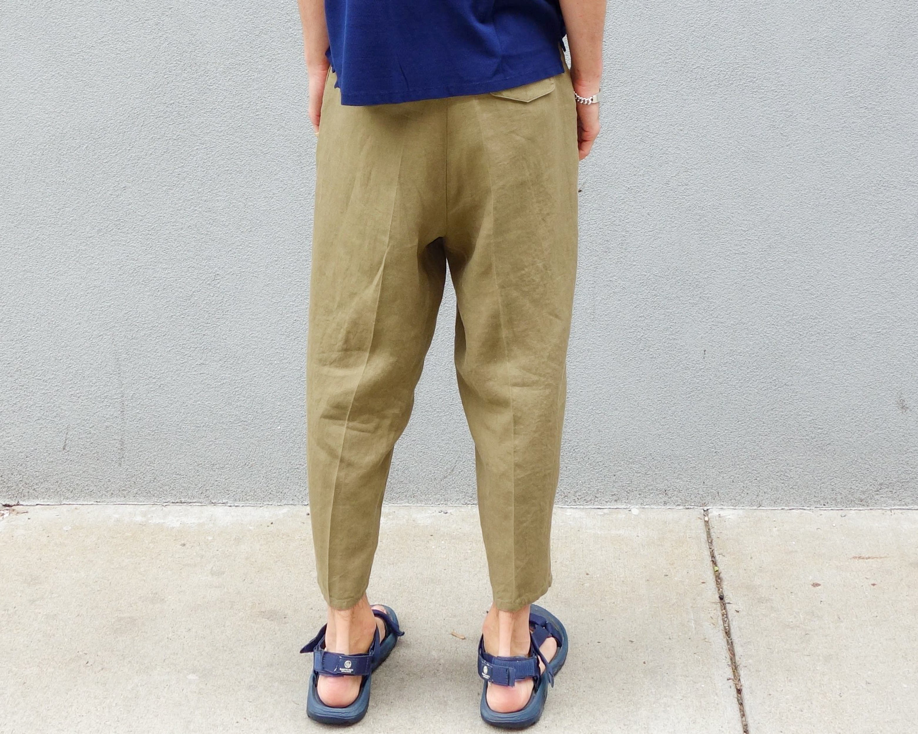 The Truro Pant; pleated and made from a lightweight linen. A wide, relaxed thigh with a taper down the leg, leading to a perfect crop length for summer, and a casual center crease.