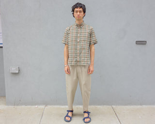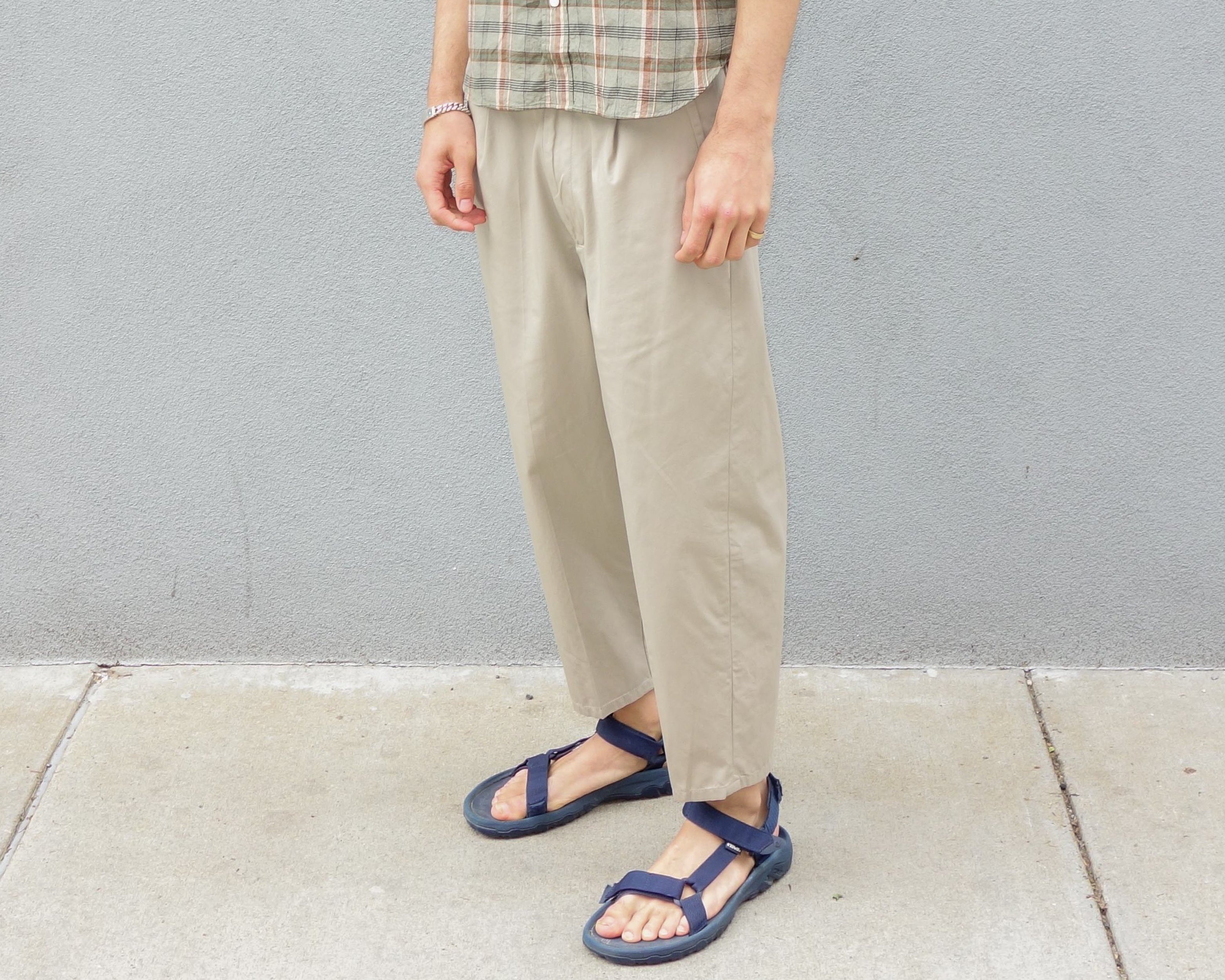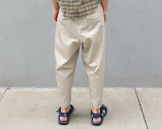 The Truro Pant; pleated and made from a lightweight technical cotton. A wide, relaxed thigh with a taper down the leg, leading to a perfect crop length for summer, and a casual center crease.
